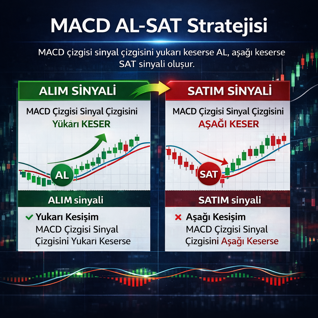 MACD çizgisinin sinyal çizgisini yukarı kesmesi genellikle alım sinyali, aşağı kesmesi ise satım sinyali olarak yorumlanır.
